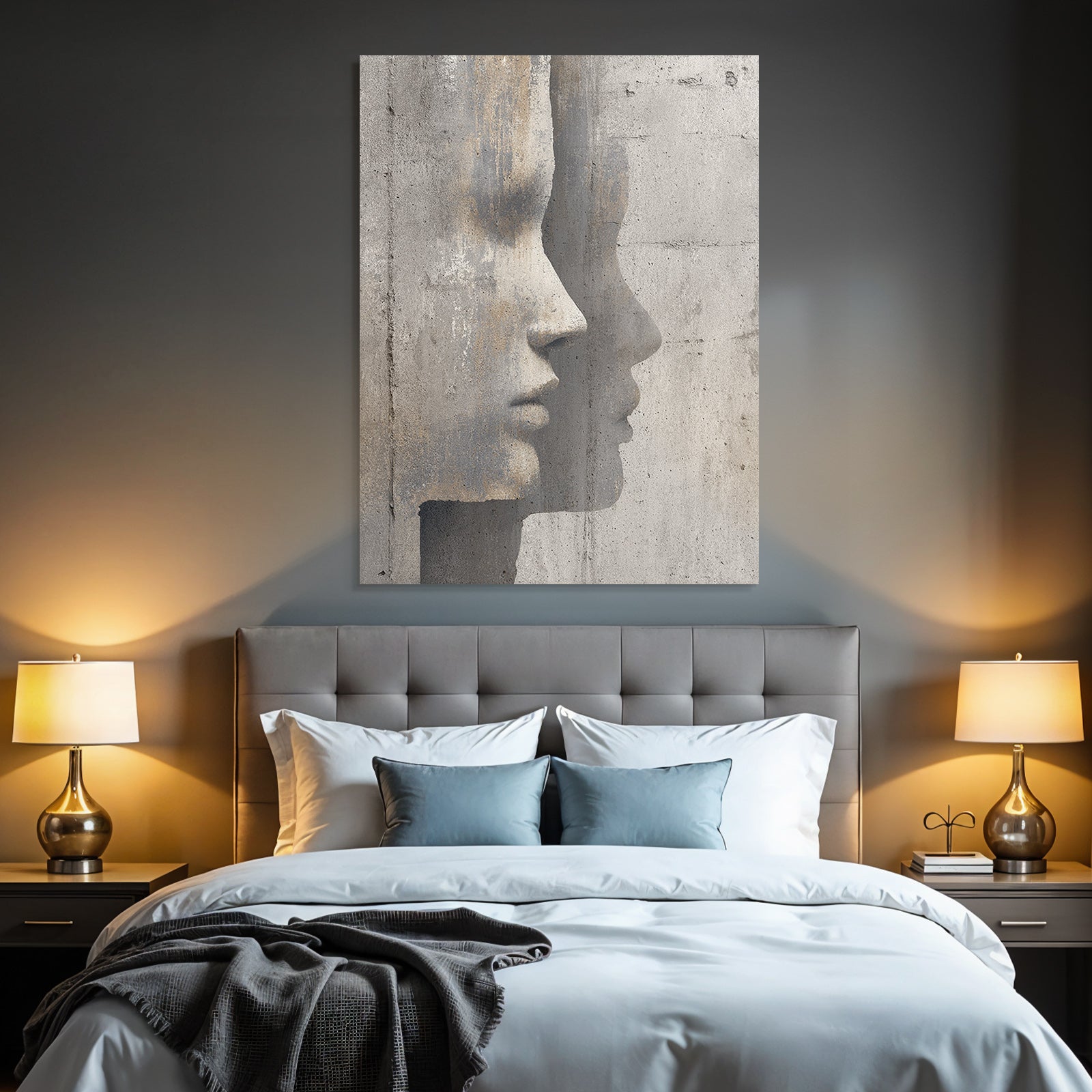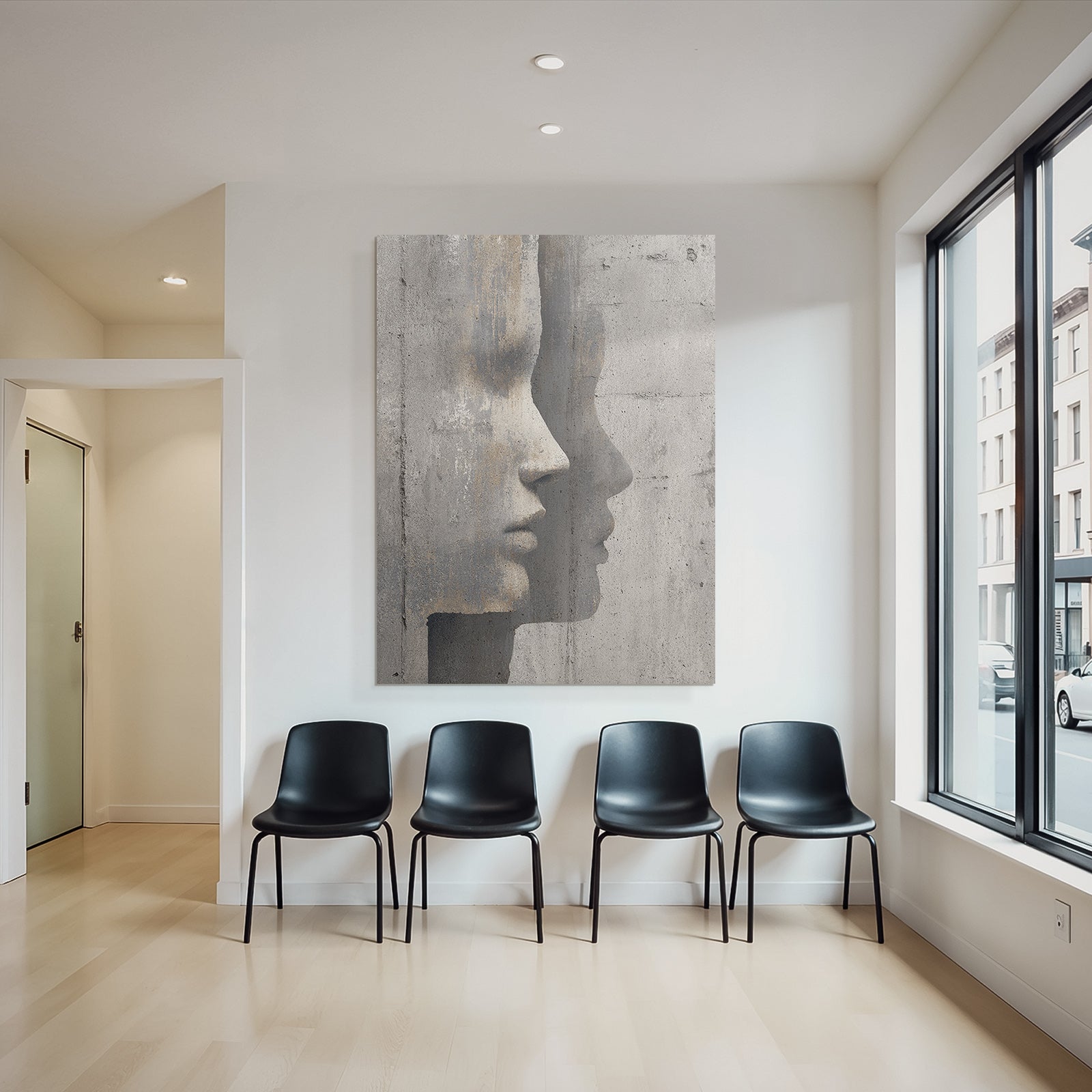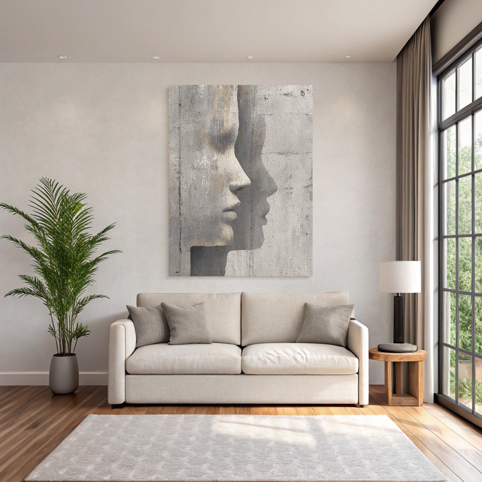 Ob Flur, Wohnraum oder Wartebereich – das Motiv „„ Zwei Gesichter Verschmelzung Beton Textur““ im Stil Industrial wirkt durch den hochwertigen FameFrame besonders modern.